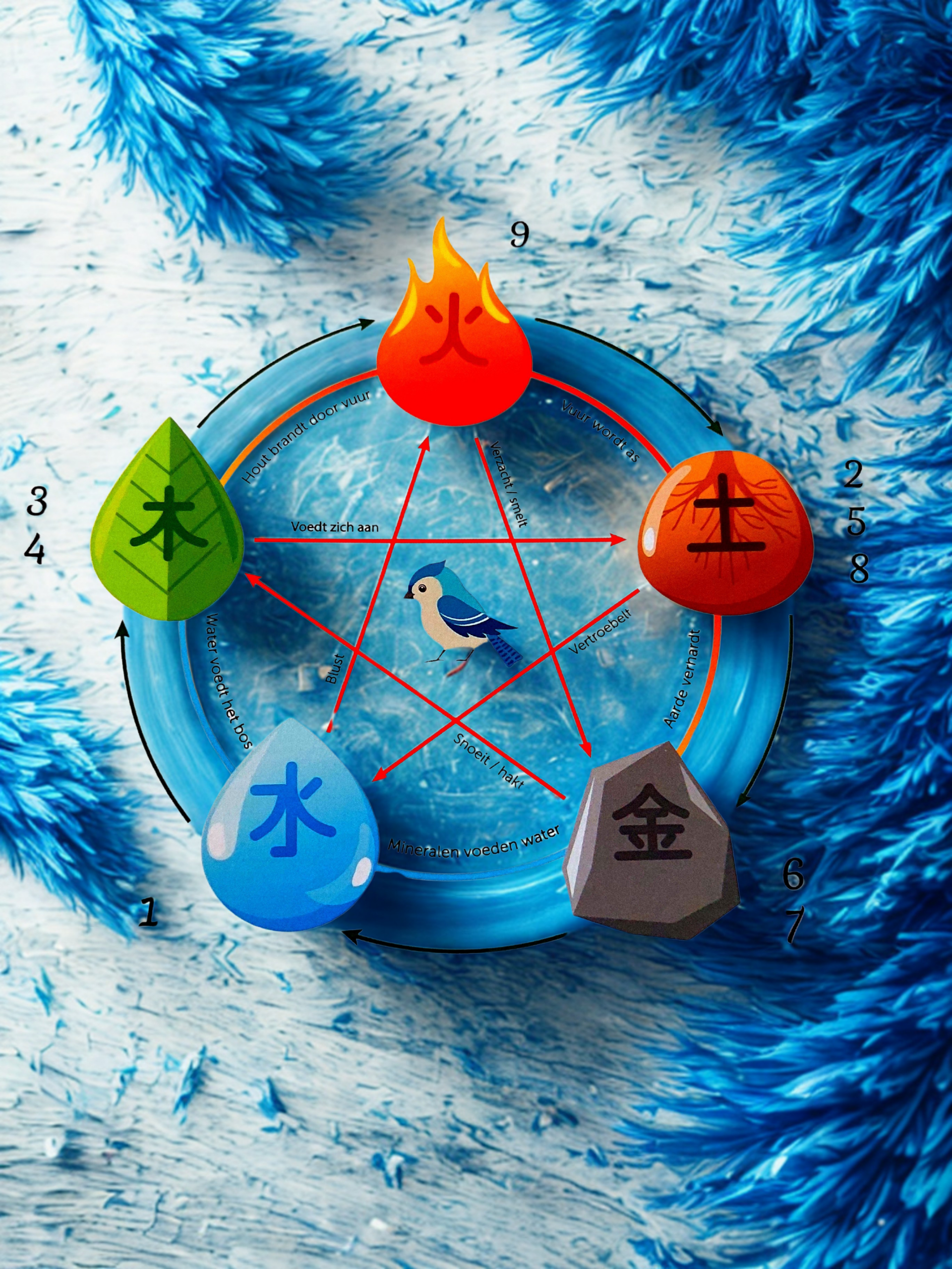 Tijdens het consult werk ik met de 5 elementencyclus: vuur, hout, aarde, metaal en water. Deze elementen vormen samen een opeenvolgende reeks die elkaar ondersteunen en versterken. Wanneer je goed in je vel zit, blijft deze cyclus harmonieus in balans en voeden de elementen elkaar. Maar zodra één of meerdere elementen uit balans raken, verandert de dynamiek. Dit kan ertoe leiden dat een element wordt overgeslagen, wat een controlerende of zelfs destructieve werking tot gevolg kan hebben.